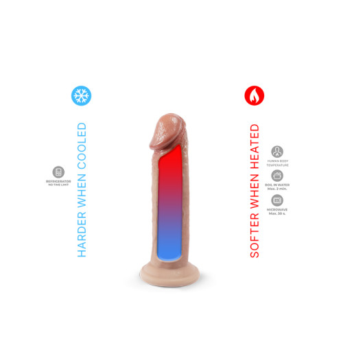 Dildoen er laget i termoreaktivt silikon, som betyr at den tilpasser seg temperaturen. Ønsker du den ekstra myk og ettergivende? Varm den opp. Vil du ha mer motstand og fasthet? Avkjøl den. Du bestemmer, kroppen følger etter.