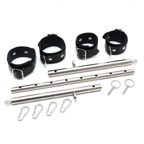 Kommer med en justerbar benspreder, 4 karabinkroker, 2 ankelcuffs og 2 håndcuffs.