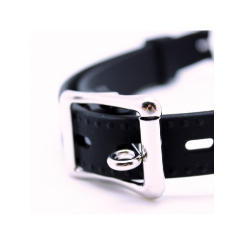 Gag med åpen O-ring i silikon, som er snillere mot tenner enn både plastikk og metall. Gagen er enkel å justere slik at den sitter perfekt og kan også låses med hengelås om ønskelig.