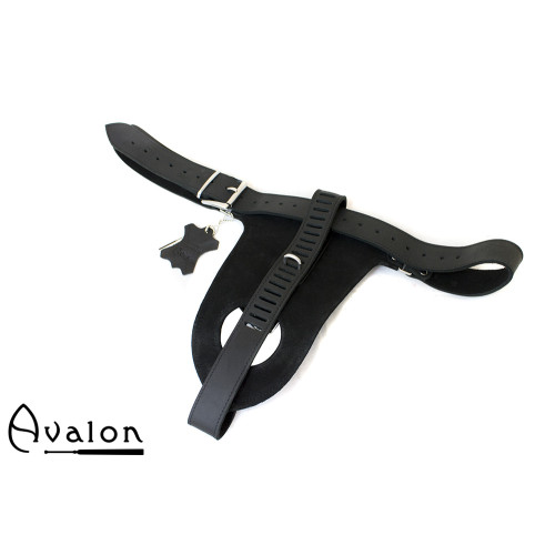 Etikett: Avalon, harness, bdsm, lær, leather, justerbar, spenner, sort, D-ringer, penis, punk, sele