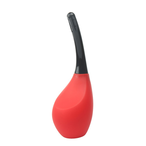 For rengjøring før anallek. En rød ballpumpe av gummi med to klysterkanyler i forskjellige større..