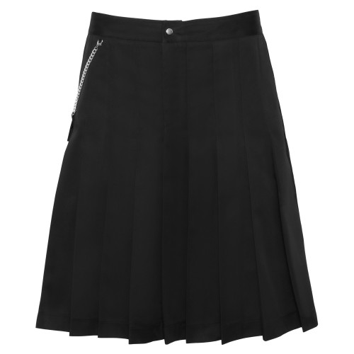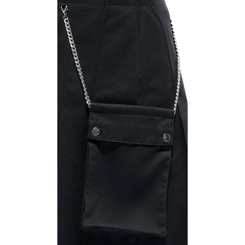 Skjørtet har en kilt-inspirert design med en lomme inkludert, komplett med snapkroker og kjeder for et rått preg. Den faste, vevde stoffstrukturen gir skjørtet en stram passform øverst, før det åpner seg i flere legg nederst, noe som gir deg bevegelsesfrihet og komfort. Skjørtet har en beltehempe med trykknapper og en skjult glidelås. Lommen er avtagbar og kan justeres med kjedene, noe som gir deg muligheten til å tilpasse stilen din. Dette skjørtet er det perfekte valget for de som ønsker en unik og dristig look.