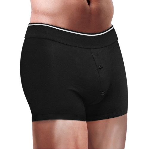 Med knappene på framsiden kan du lukke igjen åpningen foran slik at den ser ut som en vanlig bokser når den ikke brukes som strap-on.