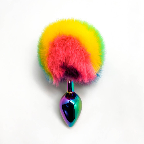 En snerten buttplug i stål med en regnbuefarget kaninhale, perfekt for lekent petplay!