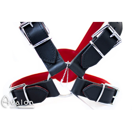 Etikett: Avalon, harness, bdsm, lær, leather, justerbar, spenner, rødt, sort