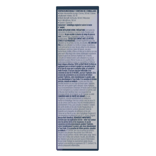 Hair Removal Cream. Ingredients: Aqua, Cetearyl Alcohol, Potassium Thioglycolate, Calcium Hydroxide, Urea, Paraffinum Liquidum, Ceteareth-20, Ceresin, Steareth-21, Glycerin, Parfum, Steareth-2, PotassiumHydroxide, Kaolin, Cetyl Hydroxyethylcellulose, Sodium Gluconate, Butyrospermum Parkii Butter, Geraniol, Citronellol, Limonene.Multi-Benefit Foam. Ingredients: Aqua, Panthenol, Paraffinum Liquidum, Butane, Steareth-2, Ceteareth-12, Isobutane, Stearyl Alcohol, Propane, Ceteareth-20, Phenoxyethanol, Dimethicone, Allantoin, Glycerin, Distearyl Ether, Ethylhexylglycerin, Citric Acid.